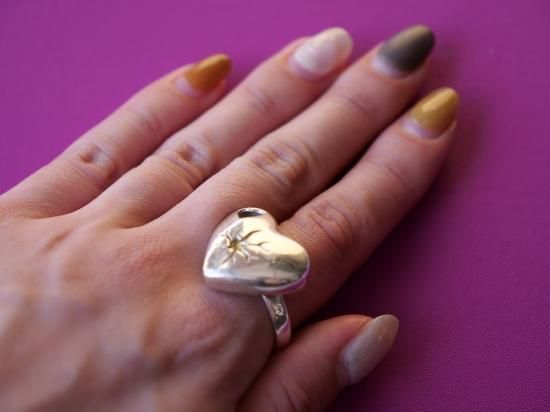 日本らしいD.I.Yとは何かというところから着想し金継ぎのイメージでハートの中央を表現しています。終わりから始まるというメッセージが込められたリング。