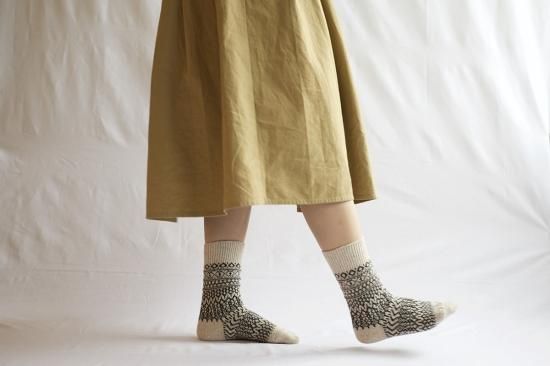 縮みにくく柔らかいのが特徴的な「防縮ウール」を使用した「ウールジャガードソックス」です。ふくらみのある「防縮ウール」をしっかりと編み上げているので、どっしりとした履き心地で、とても温く仕上がっています。洗濯を重ねても、縮みにくい設計なので、寒い冬場に、繰り返し履いていただけます。