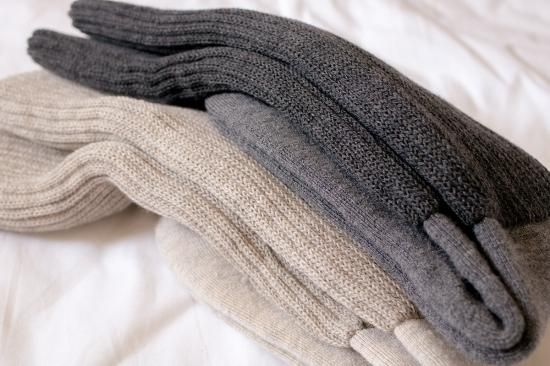 メリノウールを使用した極厚タイプの2重編ソックス。足部分はウールパイル、足首は2重編みのレッグウォーマー。ひざ下まであるので柔らかで、しっかりと温めてくれます。