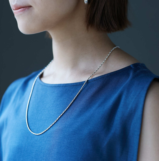 定番のシルバービーズとボールチェーンのような艶感のあるビーズを組み合わせたシンプルなネックレス。1つだけでも凛とした存在感がありますが、ネックレスなどと重ね付けもしやすいので持っていてとても便利なアイテムです。フックを前に持ってきて着用するのもおすすめです。