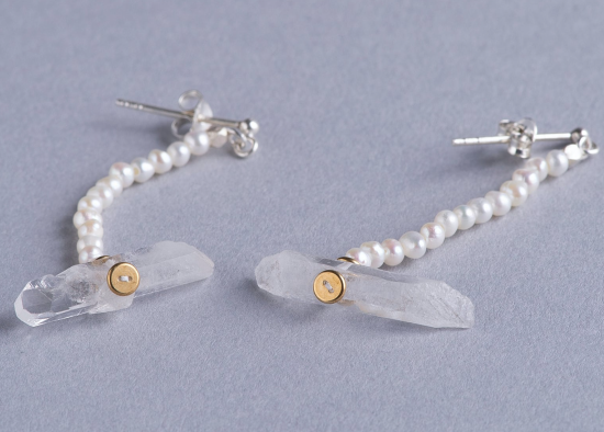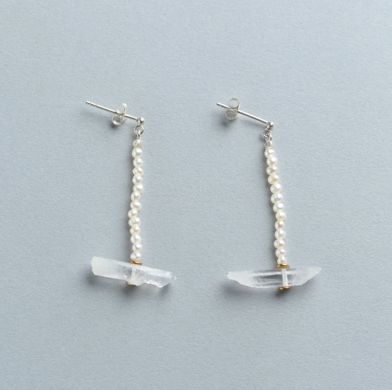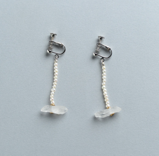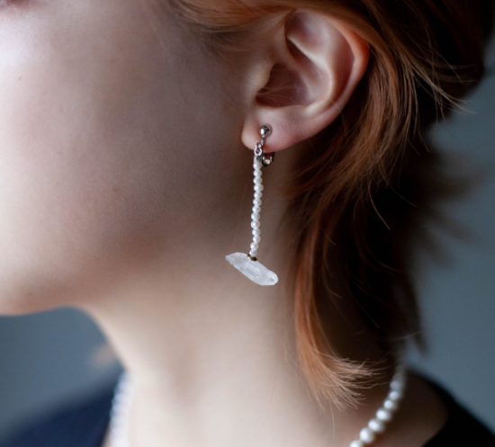 不揃いの小粒なパールの先っぽで揺れる透明感あるクォーツが顔まわりを