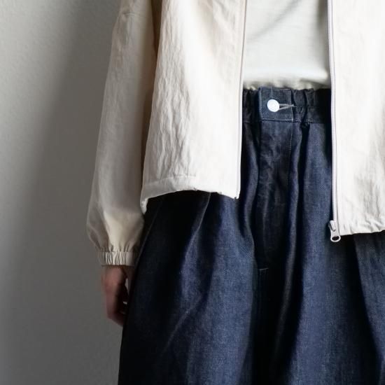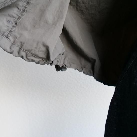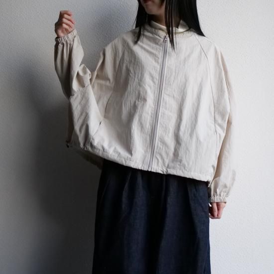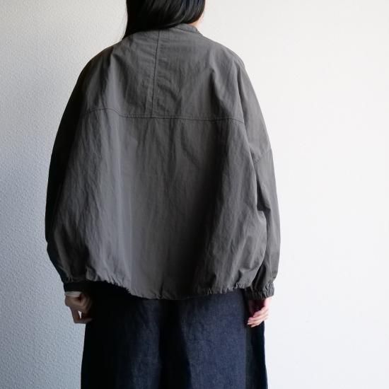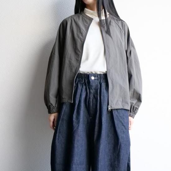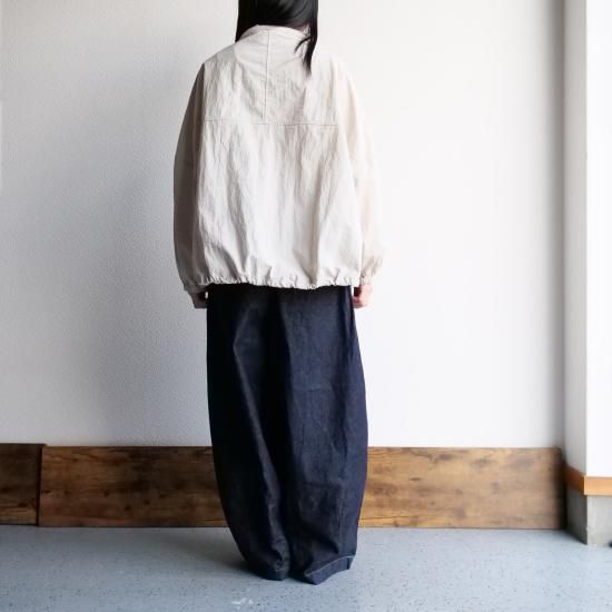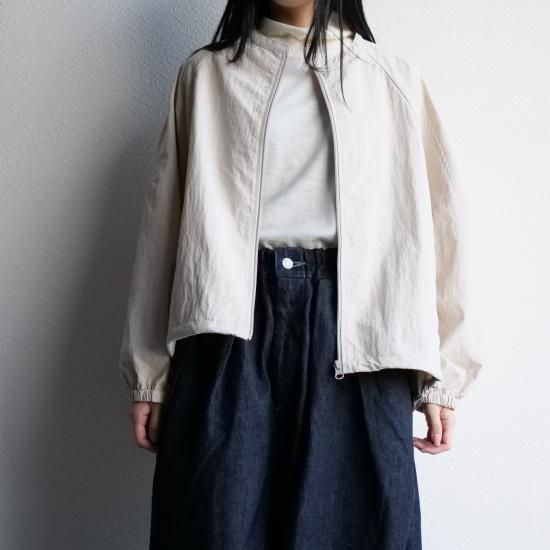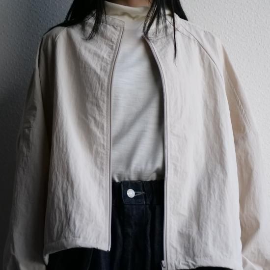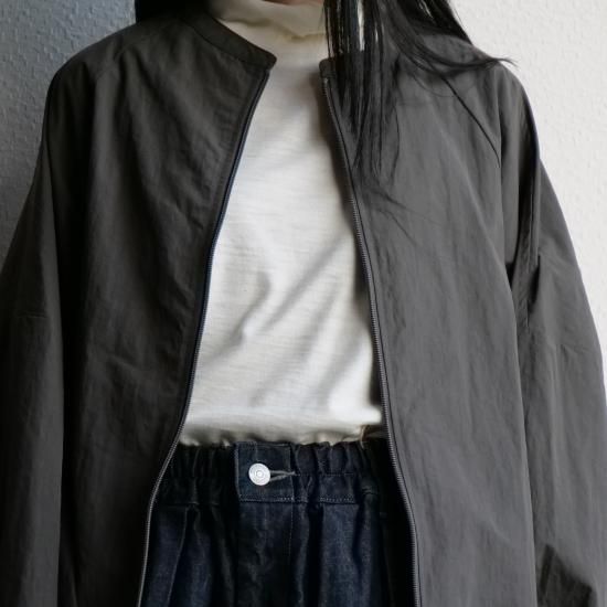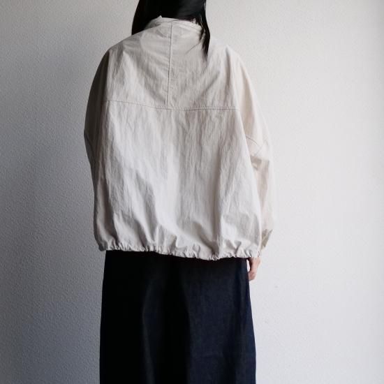 高密度に織られたナイロン100%素材を使用し、コットンのような柔らかな風合いとナイロン特有の軽さを兼ね備えた1着。シボ感のある独特の表面感が、まるで洗いをかけたような自然な雰囲気を演出し、上品なカジュアルスタイルにぴったりです。