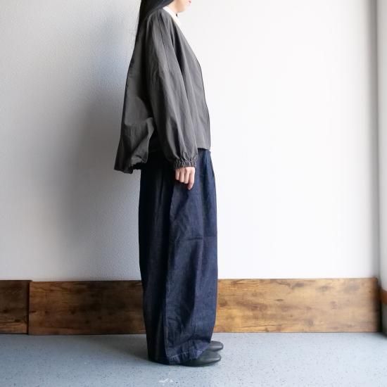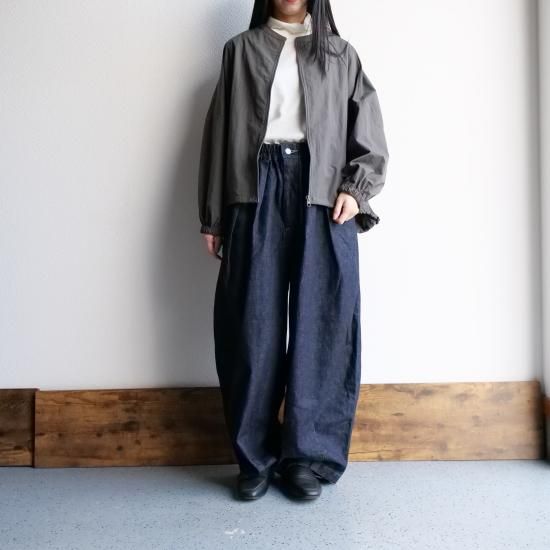 裾のドローコードを絞れば、まあるい後ろ下がりのシルエットに変化。体を優しく包み込むフォルムが愛らしく、女性らしい柔らかさを引き立てます。ゆったりとした身幅は、インナーを重ね着しても窮屈感がなく、ロングシーズン活躍してくれる万能アイテムです。
